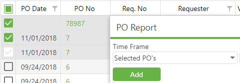 Under the time frame option, we can select a default set of ranges, a specific range (based on the current date), or a specific set of PO's that were selected prior to clicking the Open PO Report button.