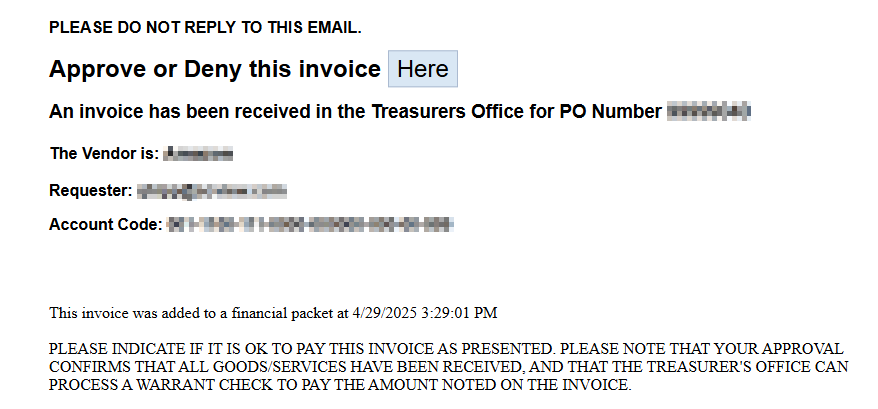 When an invoice is scanned and assigned to a requester, an automated email is sent out containing details about the invoice along with a link for easy approval. Though the appearance of this email may vary by district, the core elements remain consistent.