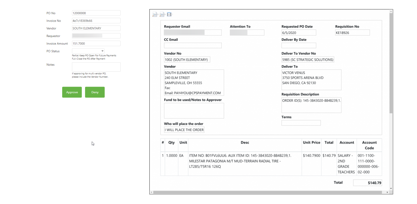Once authenticated or directed appropriately based on their login status, the user will encounter an interface (which may slightly differ from district to district) where they can review the invoice details. Here, users have the option to add notes for record-keeping, select whether the approval is partial or full, and ultimately choose to approve or deny the invoice.
