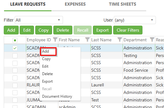 3. Click the Add button or right-click from the context menu and click on Add to create a new leave request.