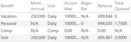 Balance details are available in the upper-right corner of the form. There are two columns of details. The Balance column is the balance available in the USPS system. The Total Queued column on the right shows how much time is scheduled to be taken, as it is in workflow, but has not yet been fully processed.