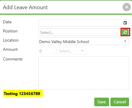 Position: The position to be used to take the leave. If there is a position missing from the list or one that should not be in the list, clicking the Refresh Positions icon (circled in red) will pull in the most up-to-date positions for the employee from USPS.