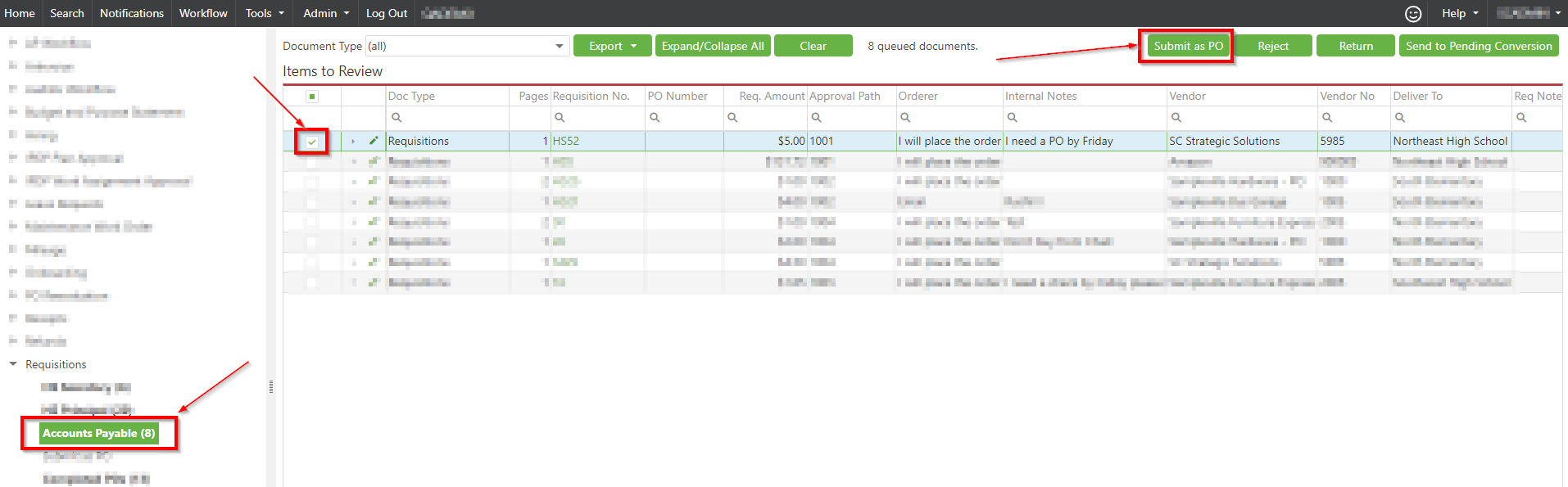- Navigate to Workflow and access the requisition submission queue.