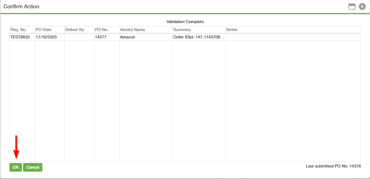 - Click "OK" to submit the requisitions to USAS.