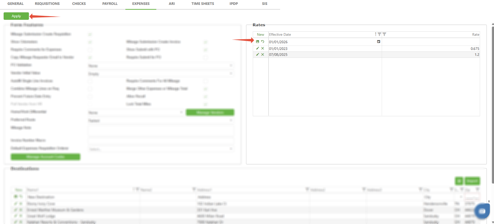 To create a new rate, click the New button and type out the Effective Date and Rate in the fields labeled. Then click the Save icon. Lastly, click the Apply button on the top left corner of the Settings page.