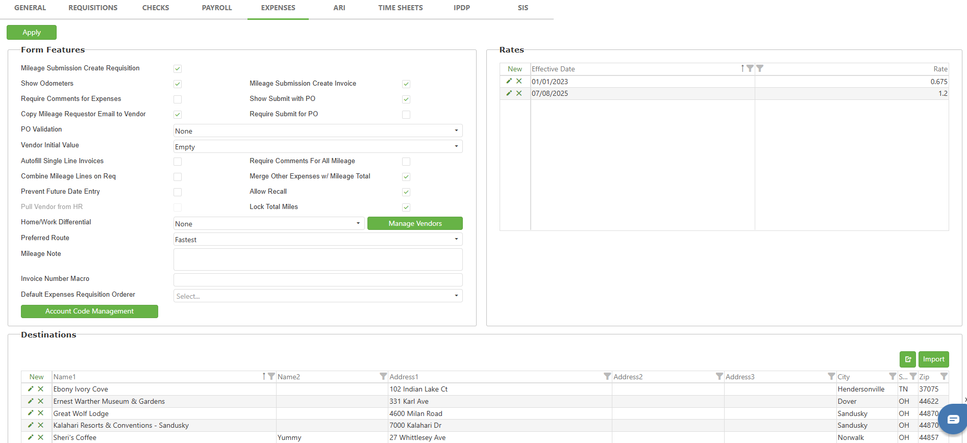 Mileage Destinations - Add destinations on this setting page (shown below) in order to display them on the mileage form as drop-down options for both From and To destinations rather than typing them out on the form.