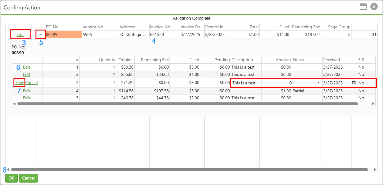 - Assessing and editing the invoice on the confirmation screen just before submission. This screen allows for specific edits to the upper lines (vendor number, invoice number) with an edit button (3) and, after clicking, inputs for editing (4). Lower lines can also be adjusted by expanding (5), editing (6), and saving (7). After confirming details and edits, click OK (8) to submit to USAS.