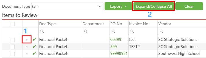 - Expanding each invoice using the arrows on the left (1) for detailed inspection. Utilize the Expand/Collapse All button (2) for handling multiple items.