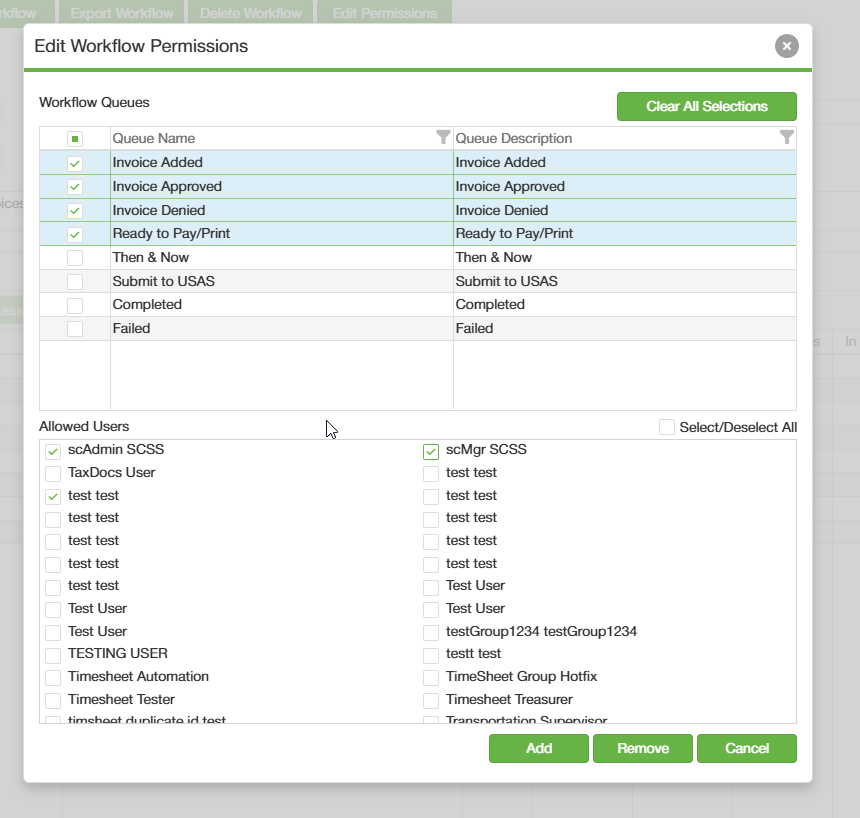 - Clear All Selections - This will remove all selections made on the queues and allowed users. This will have no effect on what has already been saved.