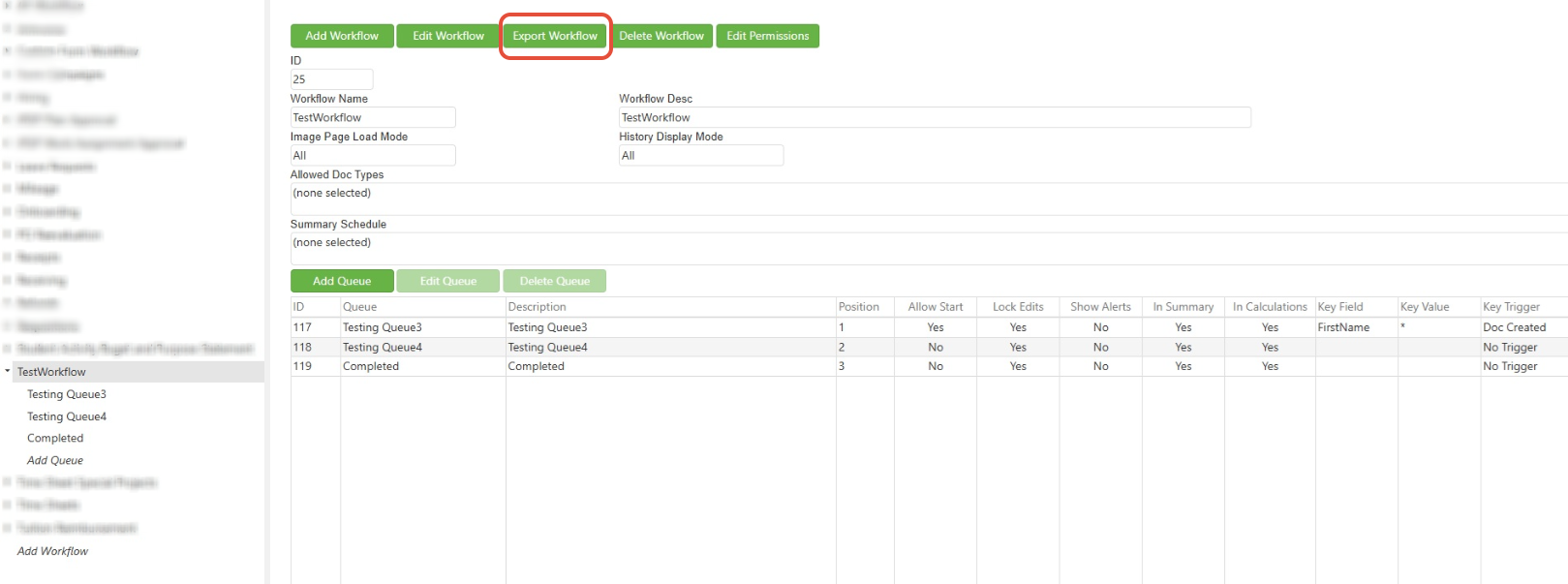 Once built, the workflow can be exported by way of the Export Workflow button. This will begin downloading an Excel file which can then be edited, dragged, and dropped into the left-hand pane of the Workflow Manager page where the workflows and queues are housed.