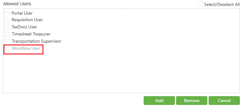 - Cancel - Will not apply anything selected and will close the Edit Workflow Permission model.