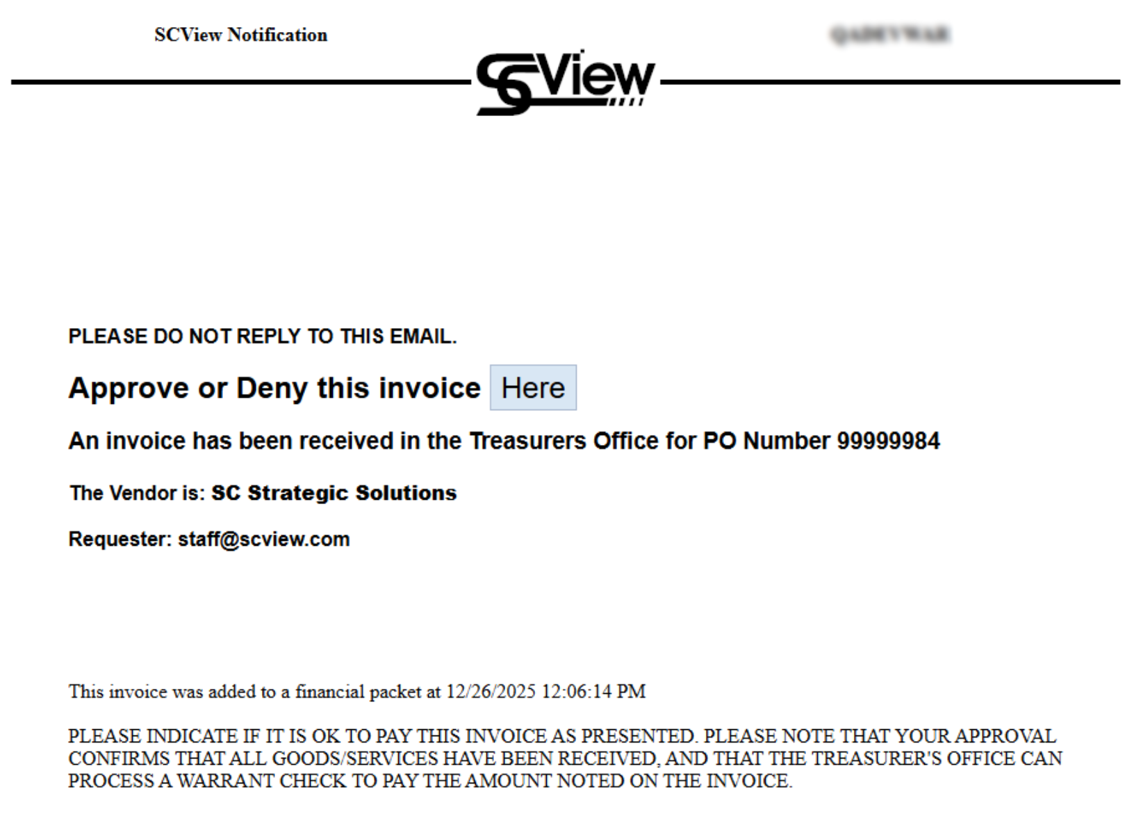When an invoice is submitted with you listed as the requester, you'll automatically receive an email notification containing key invoice information such as vendor details, amount, and other relevant data, along with an approval link for taking action.