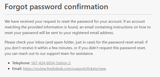 3. Once submitted, you will see following message. You should receive the email within 10 minutes. If you do not, please check your spam folder in your email inbox.