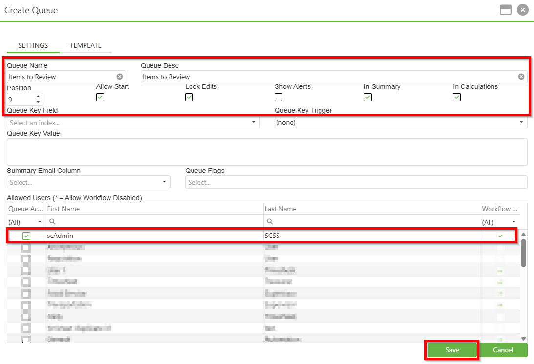 10. Fill out Queue Name, Queue Desc. Put check marks in "Allow Start", "Lock Edits", "In Summary", "In Calculations". Give access to anyone you wish to view the queue and click "Save".