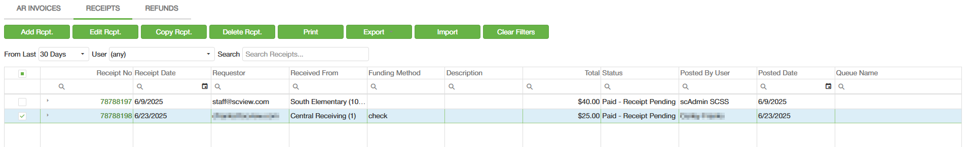 - Copy - Operates like the green Copy Rcpt. button, opening a popup with the receipt you wish to copy.
