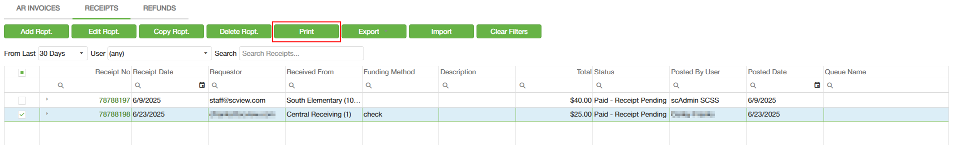 7. To print the receipt, select the receipt you want to print, then press the Print button.