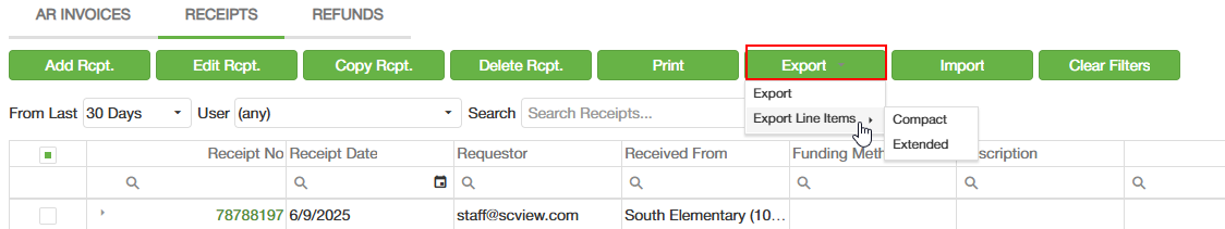 8. There are two Export options available: exporting a single receipt or exporting the entire line, either in a compact or extended format.