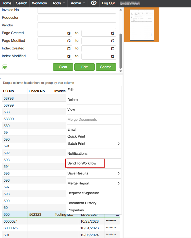 3. Click on the document and right click and click "Send to Workflow"
