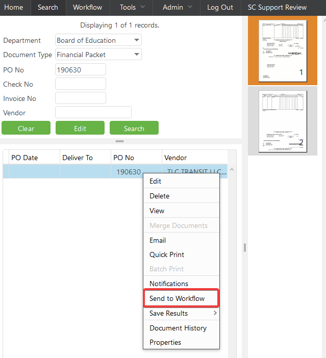 3. Click on the document and right click and click "Send to Workflow"