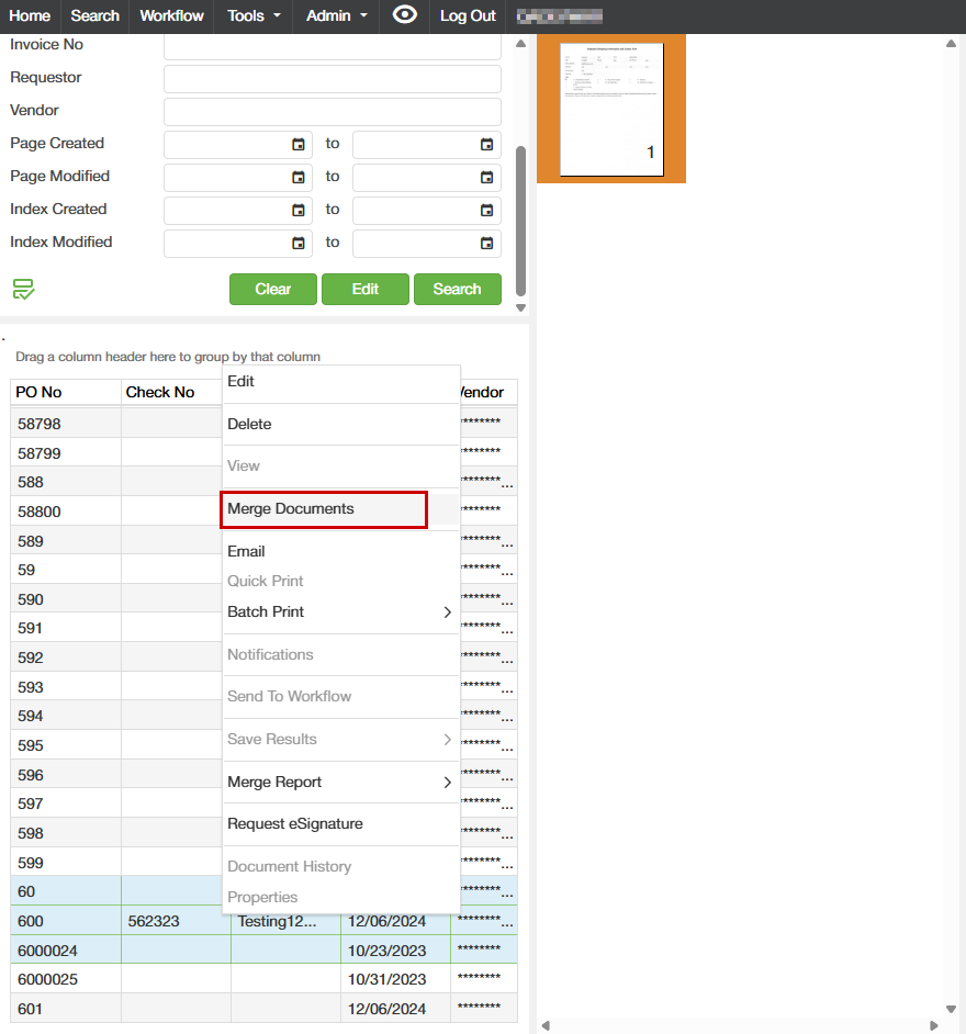 2. Select multiple documents from results by holding down the Ctrl key and clicking on each document. Then right click and click "Merge Documents"