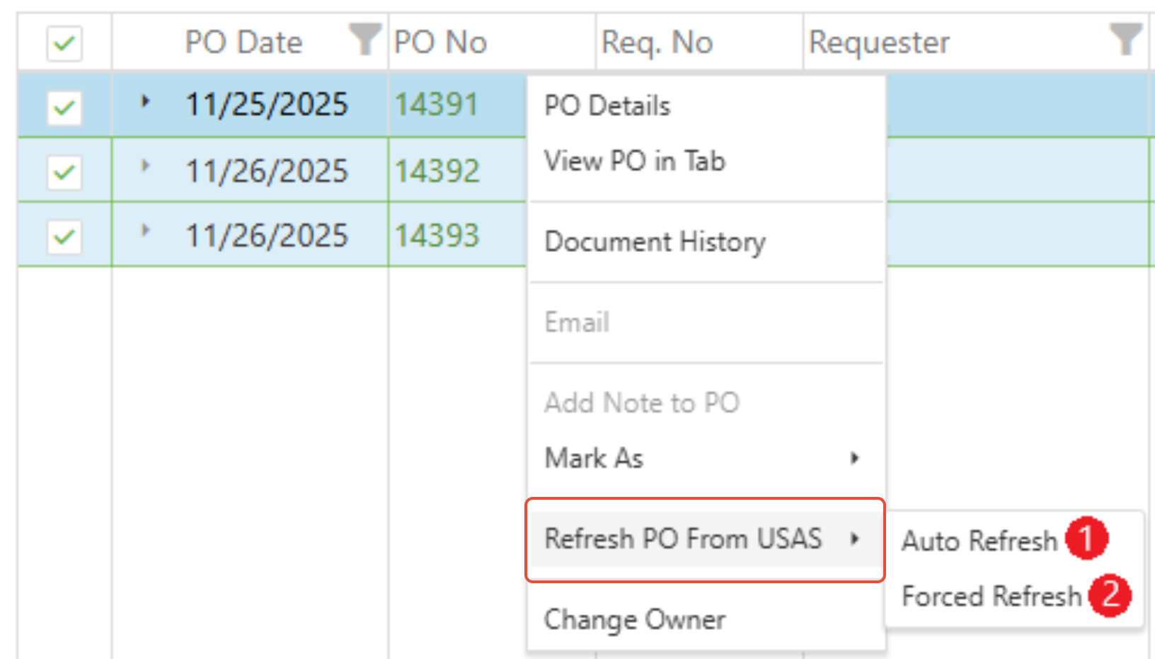 Right-click on your selected purchase order(s) and choose "Refresh PO from USAS" from the context menu. This will display the available refresh options.