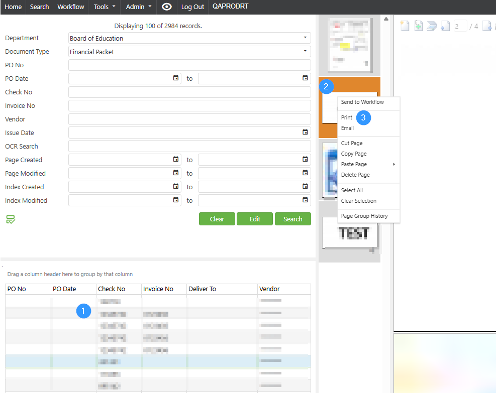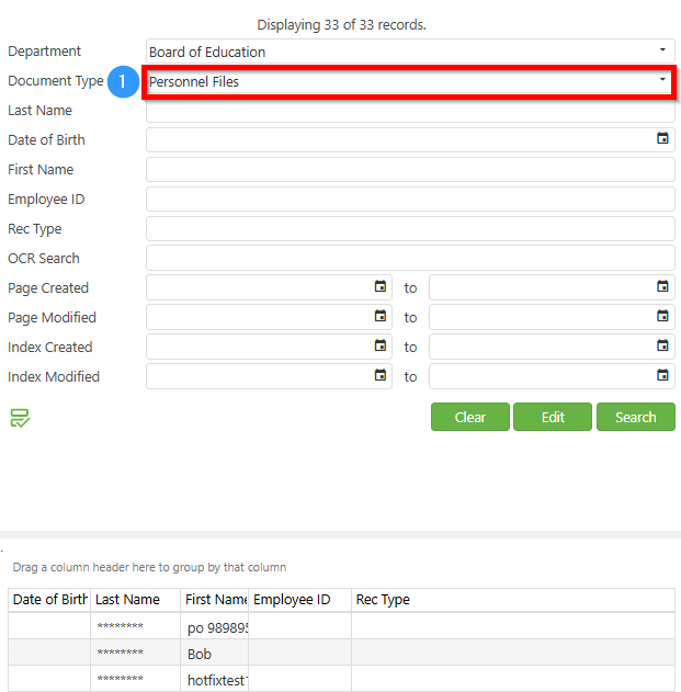 Located at the top left will be the primary search fields. Selecting a document type (1) will update the fields that are available to search by. Many searches are based off of a "starts with" criteria, which means if you are searching for Captain America, you would not be able to search for America in the name box and locate this record. Special changes need to be made to a document to widen the search criteria.