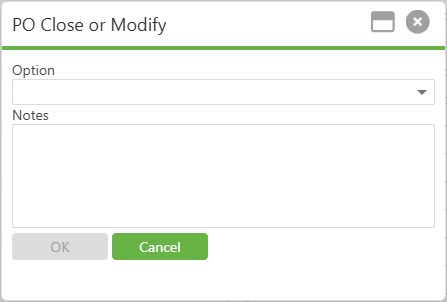 - Depending on the need, choose either "Add Note," "Close," or "Modify" and provide the necessary details for the request. These options add an entry in the audit history or send the PO to a workflow queue if configured.
