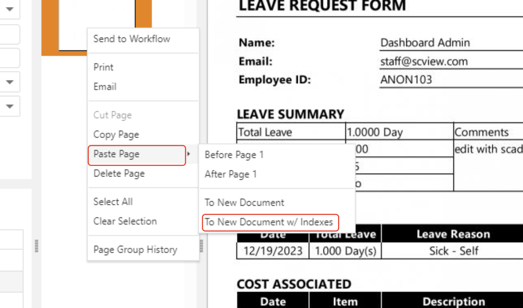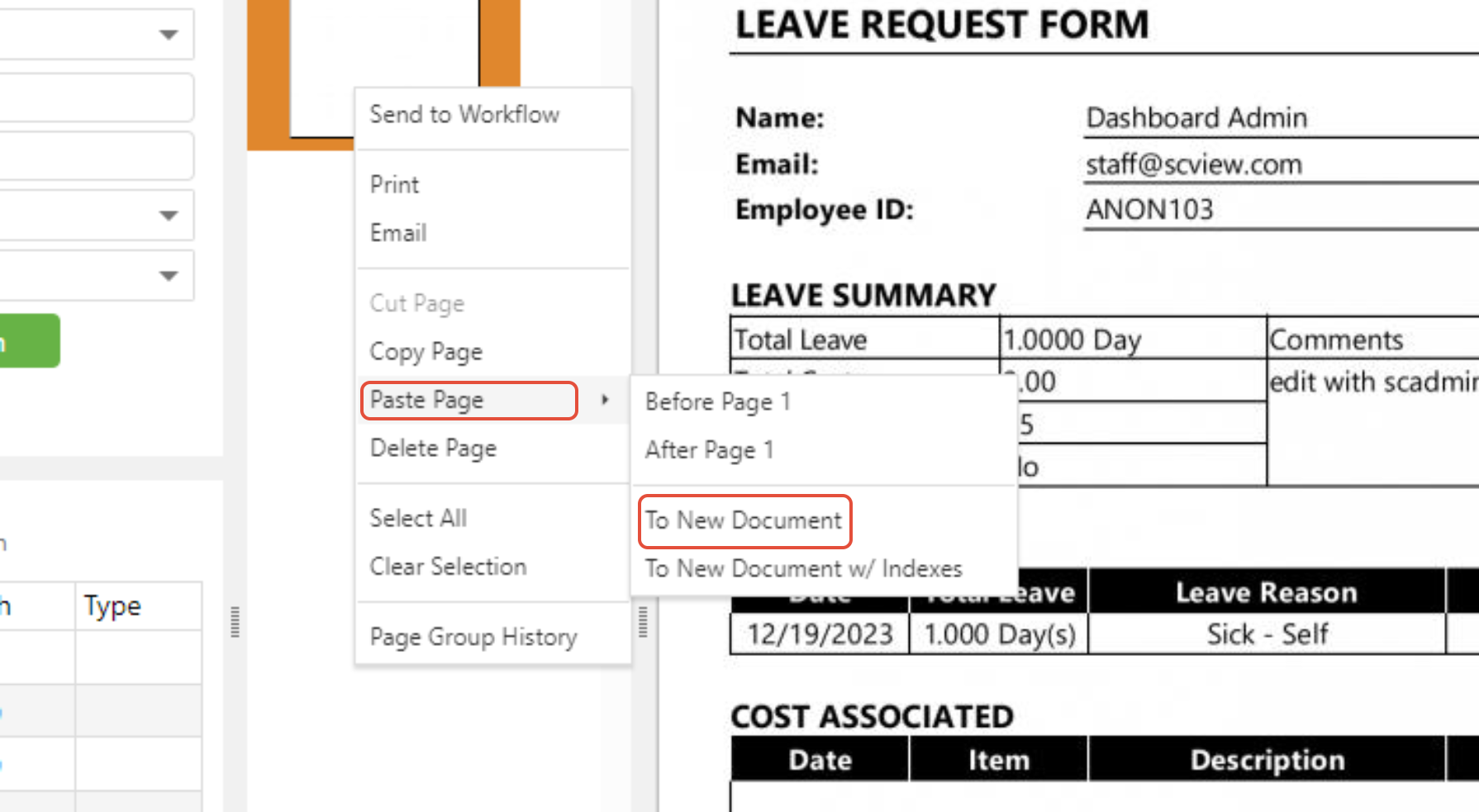 SCView addresses this need by offering a straightforward method to copy or cut pages from existing documents to create new ones. By using the "Copy Page" and "Paste Page to New Document" functions, users can efficiently duplicate necessary information while preserving the integrity of the original document. This functionality not only saves time but also reduces the risk of errors associated with manual data entry or document recreation.