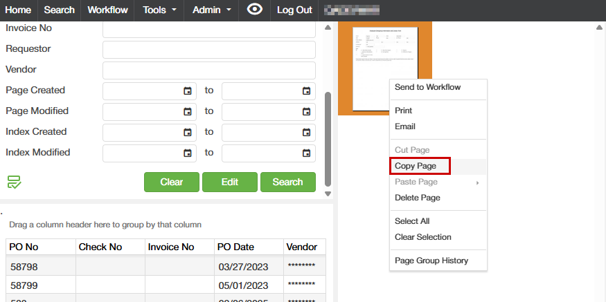1. Go to Search and select the page(s) from the document you wish to copy or cut from.