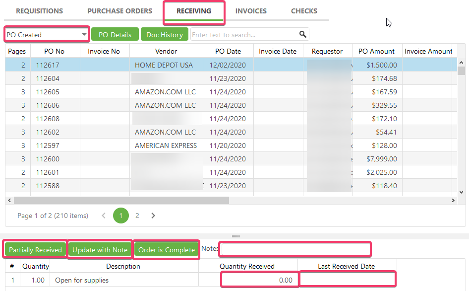 3. Before clicking any of the buttons on the bottom of this page, type in any important information in the Notes field. We would also want to double-click into the Quantity Received field and Last Received Date to enter how many items were received and when, and whether this is a complete or a partial quantity.