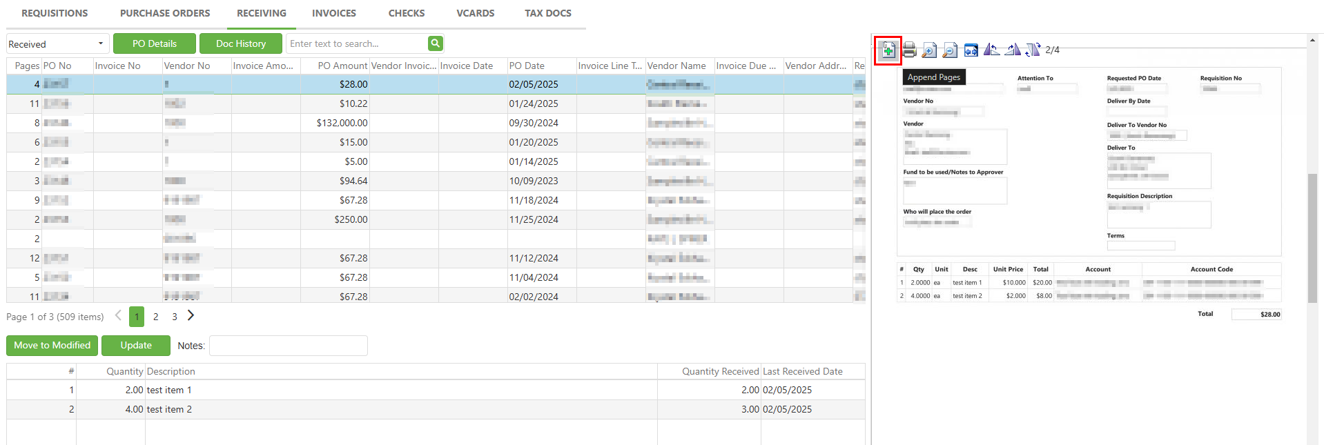 You may append any number of pages to a document from the Receiving manager page. To do so: