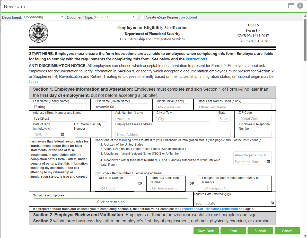 - If you are logged in either as a portal user or as an anonymous user, you will not have the capability to save the form as a draft. Additionally, you will be restricted from modifying the Department and Document Type fields, and you will not have the option to request an electronic signature upon submission. The interface will appear as depicted in the image below.