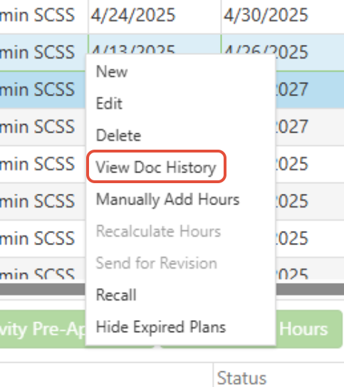 - View Doc History: Allows you to see the document history once the plan has been submitted for approval