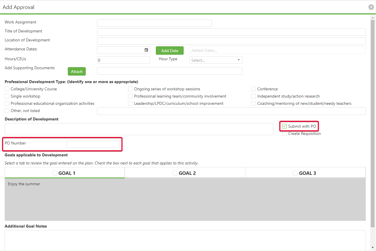 Fill in the activity with required information. Check the box labeled Submit With PO and fill in the PO number.