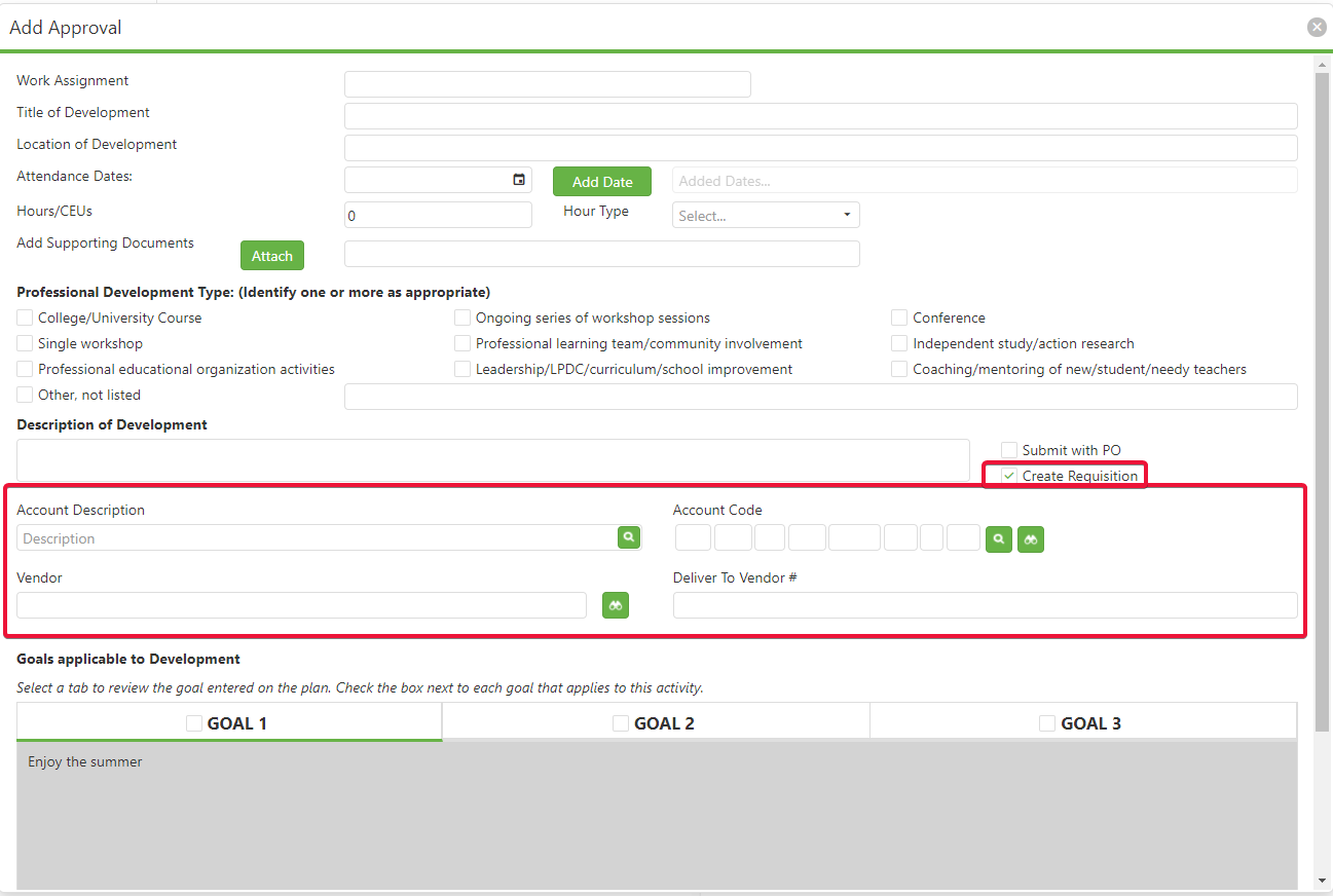 Fill in the activity with required information. Check the box labeled Create Requisition and fill in as needed. Once your IPDP activity has been approved, it will create the requisition for you automatically.