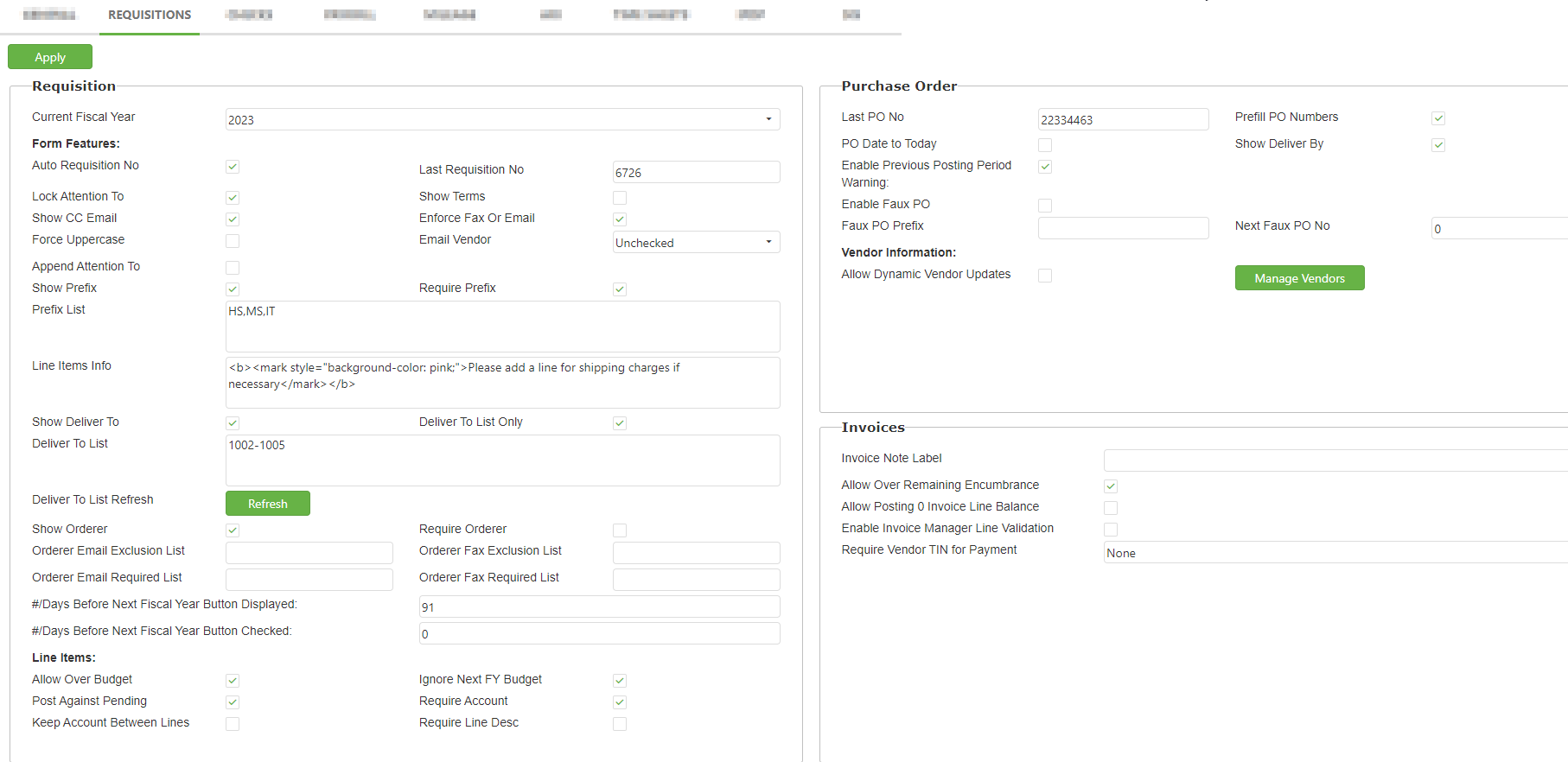 - Line Items Info: This is where you would enter any text you want to appear, as a reminder, above your line item(s) on a Requisition. An example would be "Please add a line for shipping charges."