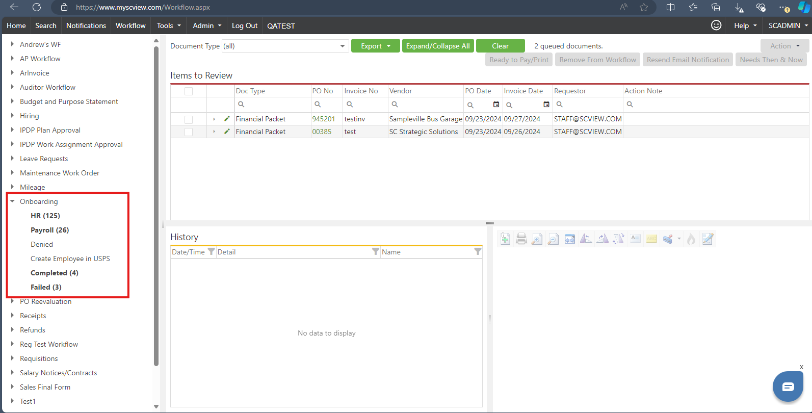 The Onboarding module allows you to submit new employees for creation in USPS. If you have access to this module but aren't set up for USPS submissions, you can contact support at support@scview.com for assistance at no extra cost. The most commonly submitted form is the "Employee General Information" form, although the name may vary. To submit a new employee, first navigate to the Workflow queue containing the relevant onboarding document. Select the document(s) and click "Submit to USPS." After verifying the information on the confirmation screen, click "OK." The submitted documents will enter a hidden queue, similar to other processes, and should complete within 15 minutes. If they do not appear in either queue after this time, contact support for help. Best practices include checking different queues for document status and waiting 15 minutes before expressing concerns. Note that button appearances may vary by database, as they are customizable. If you experience issues, support is available via chat, email, or phone.
