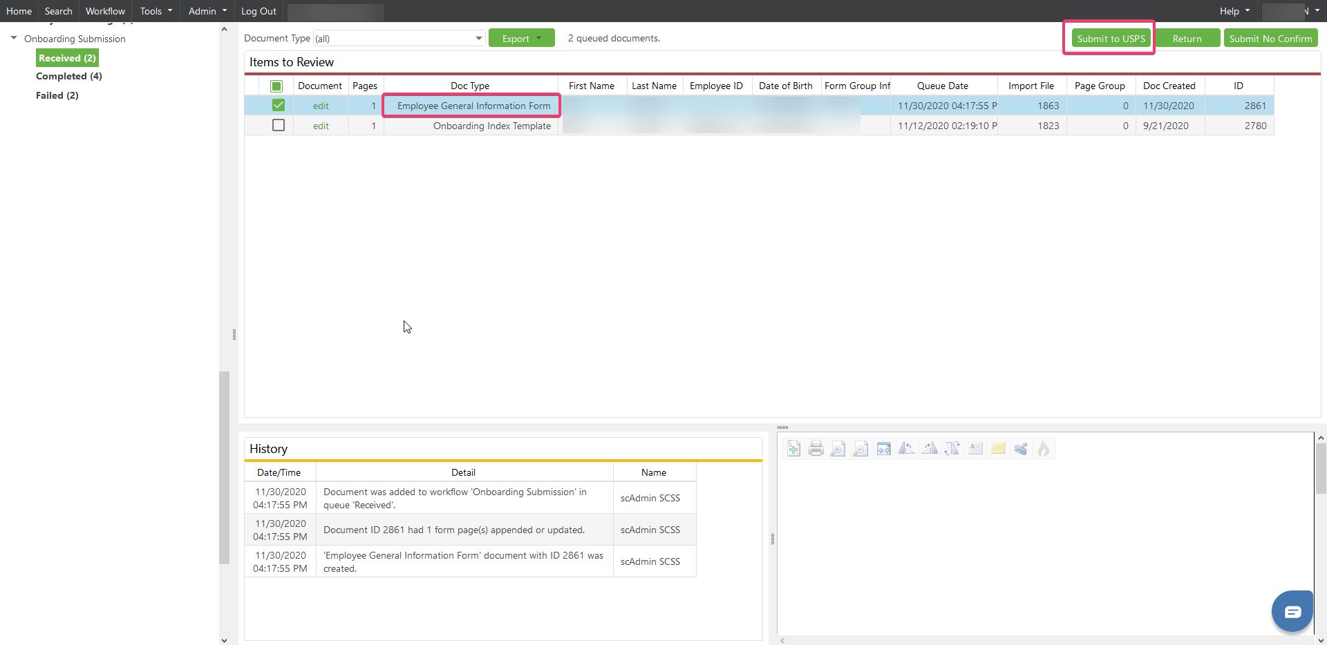 Go to the Workflow queue containing the Onboarding document type that needs to be submitted to USPS.