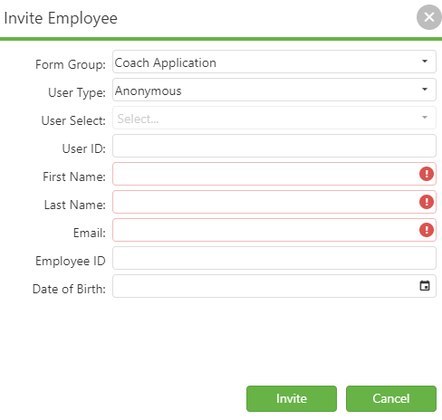 This feature allows users to transform applications or other employee files into form group invitations, facilitating the process of sending out multiple invitations simultaneously. While commonly utilized for hiring and onboarding, this functionality can be applied in various contexts. To learn more about setting up this feature, please reach out to our Support Team. When sending an invitation, a confirmation dialog box will appear, prompting you to select a Form Group and User Type—options include Anonymous, Existing, and New User. Each User Type has specific requirements and benefits, ensuring a tailored approach to inviting employees to complete their packets efficiently.