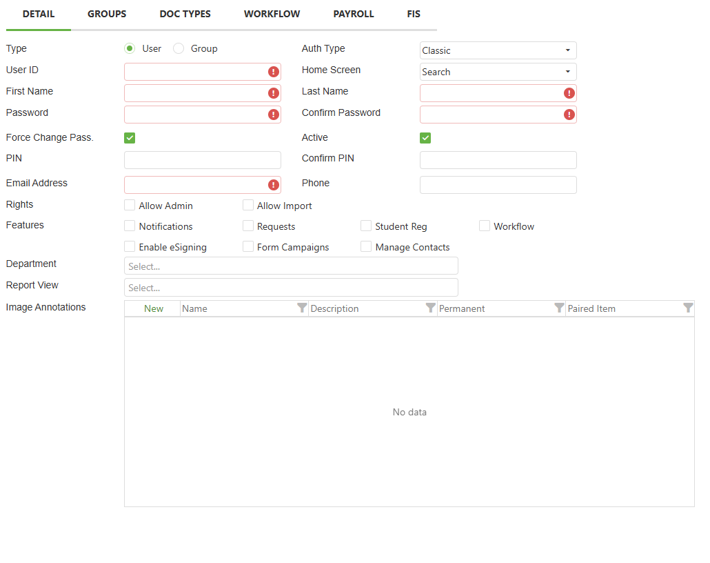 • Choose a default home screen and assign rights like Admin access, import capabilities, etc.