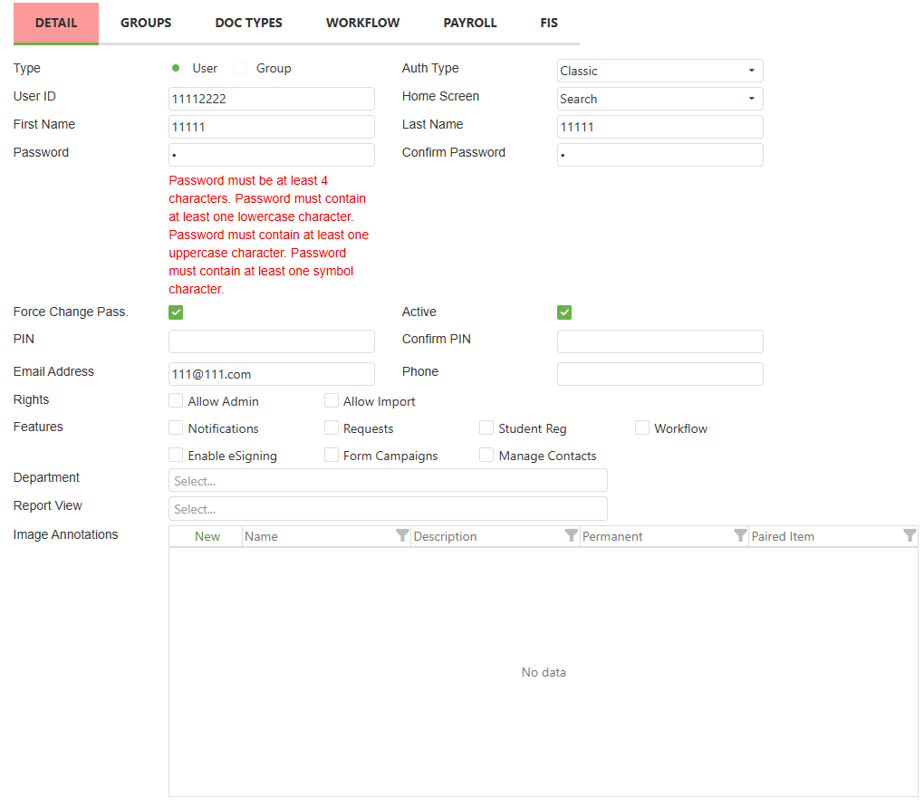 valid email address or the system will not allow you to save the user. Format example: testuser@domain.com