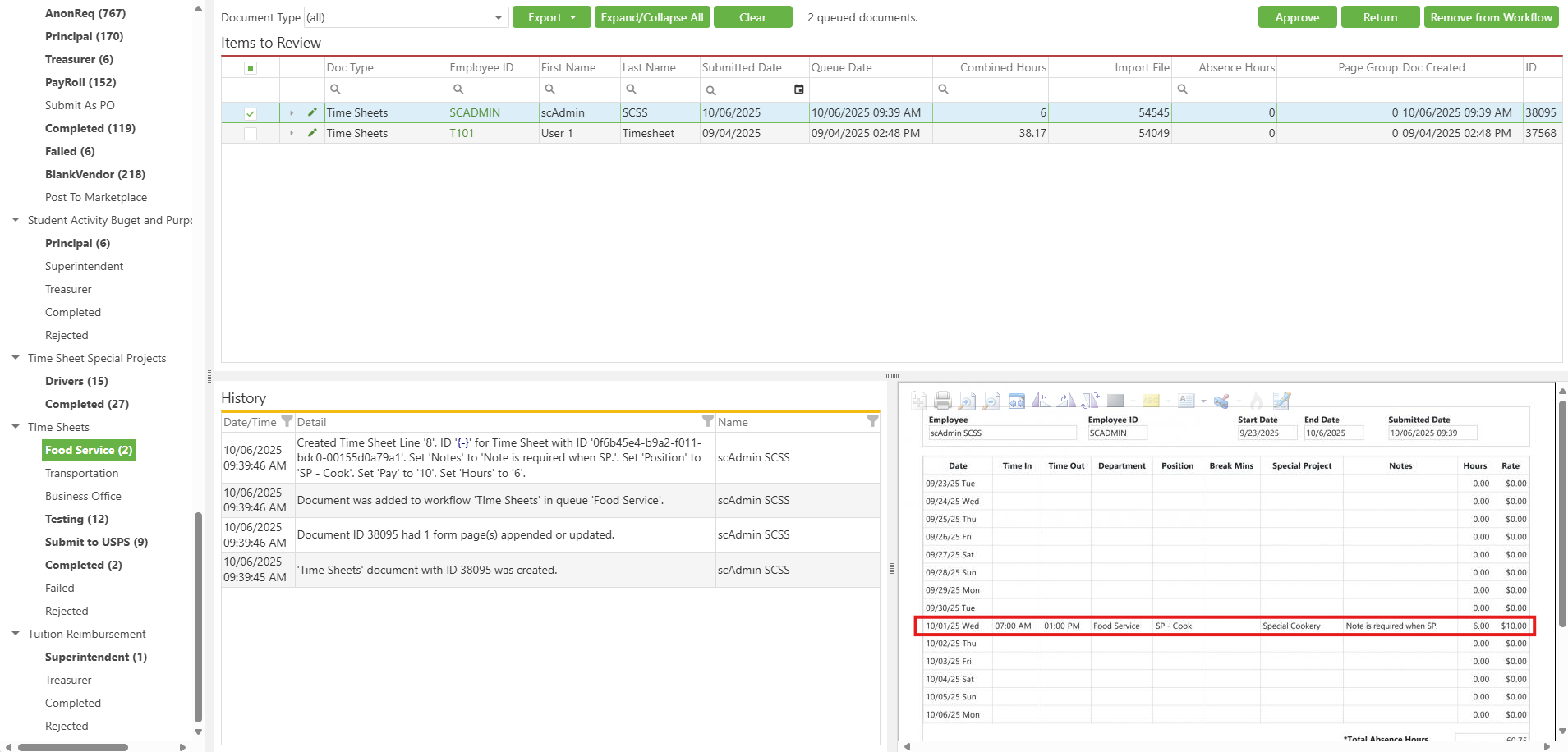 After submission, the time sheet will appear in the appropriate Time Sheets Workflow queue. Note that a time sheet with Special Projects includes a "Special Project" column containing the project's name.