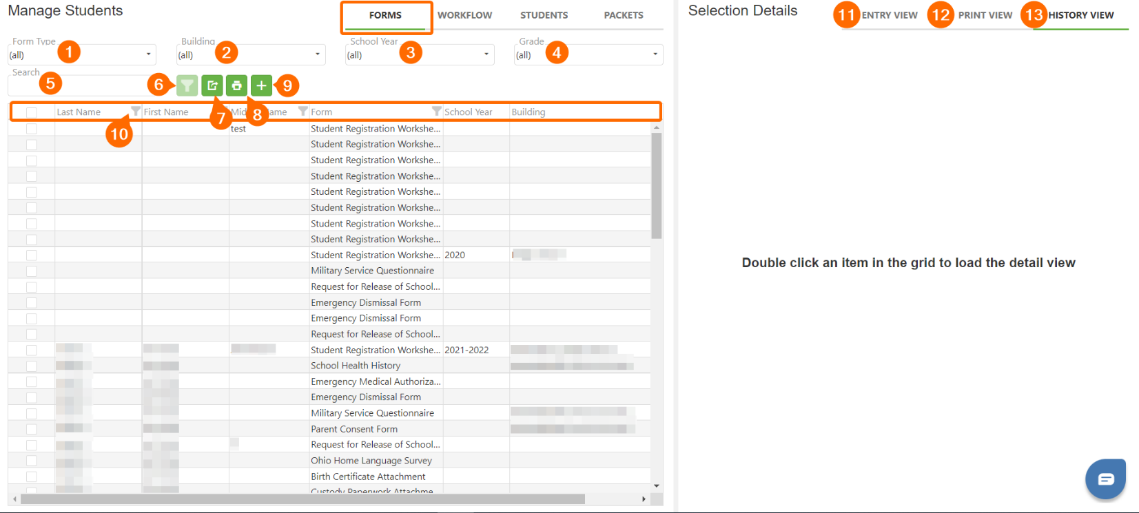 1. Filtering: Utilize the Form Type, Building, School Year, Grade, and Search drop-down functions to filter information based on your needs. This will help in presenting a cleaner, focused view which primarily contains the information that's important to you.