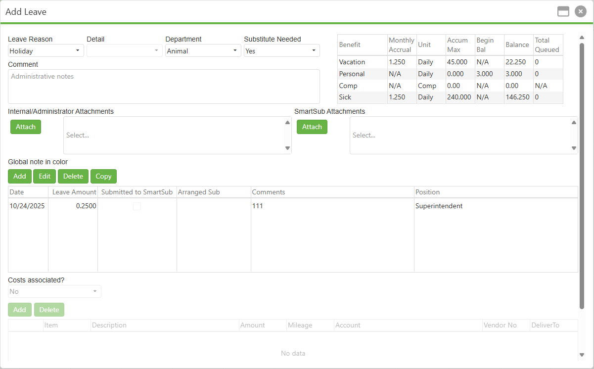 When Substitute Needed is set to Yes, several changes trigger in the Add Leave form. First, the attachments box splits into two halves: Internal/Administrator Attachments and SmartSub attachments. Any attachments placed in Internal/Administrator Attachments will be handled as they always have in SCView; meanwhile, any attachments placed in SmartSub attachments will be added to the SmartSub opening when that is created. Finally, the Location and Category fields are only enabled in the Modify Leave Amount popup if Substitute Needed is set to Yes. We will discuss these fields later.