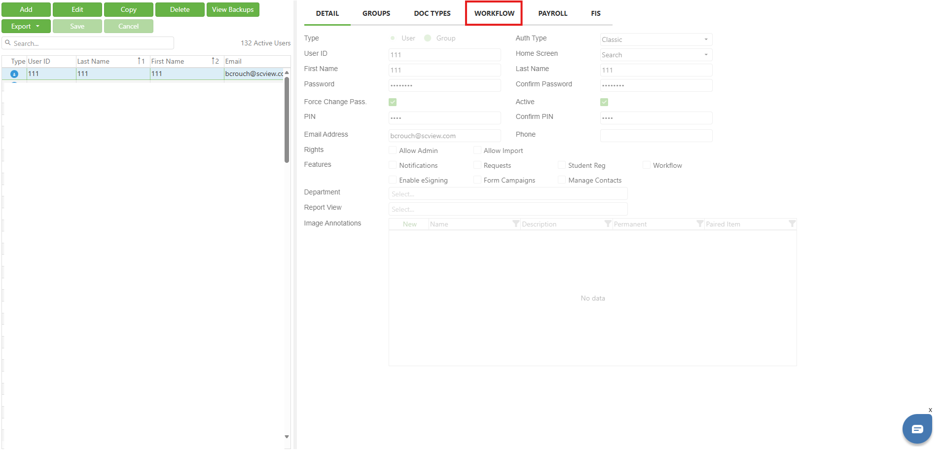 In order to enhance control over workflow queue access, SCView introduces the Users > Workflow tab. This new feature displays all workflow queues to which the user has access in a convenient, filterable grid. To follow along, please navigate to Admin > Users.