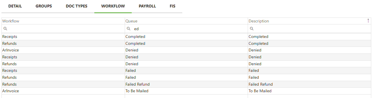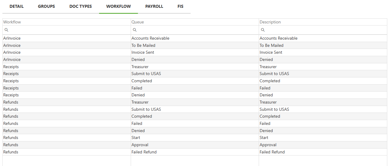 The Workflow tab is read only. Each column may be filtered by typing partial terms into the magnifying glass field found underneath each column header. Clicking a column header will sort the grid by that column alphabetically, and if clicked again, reverse alphabetically.