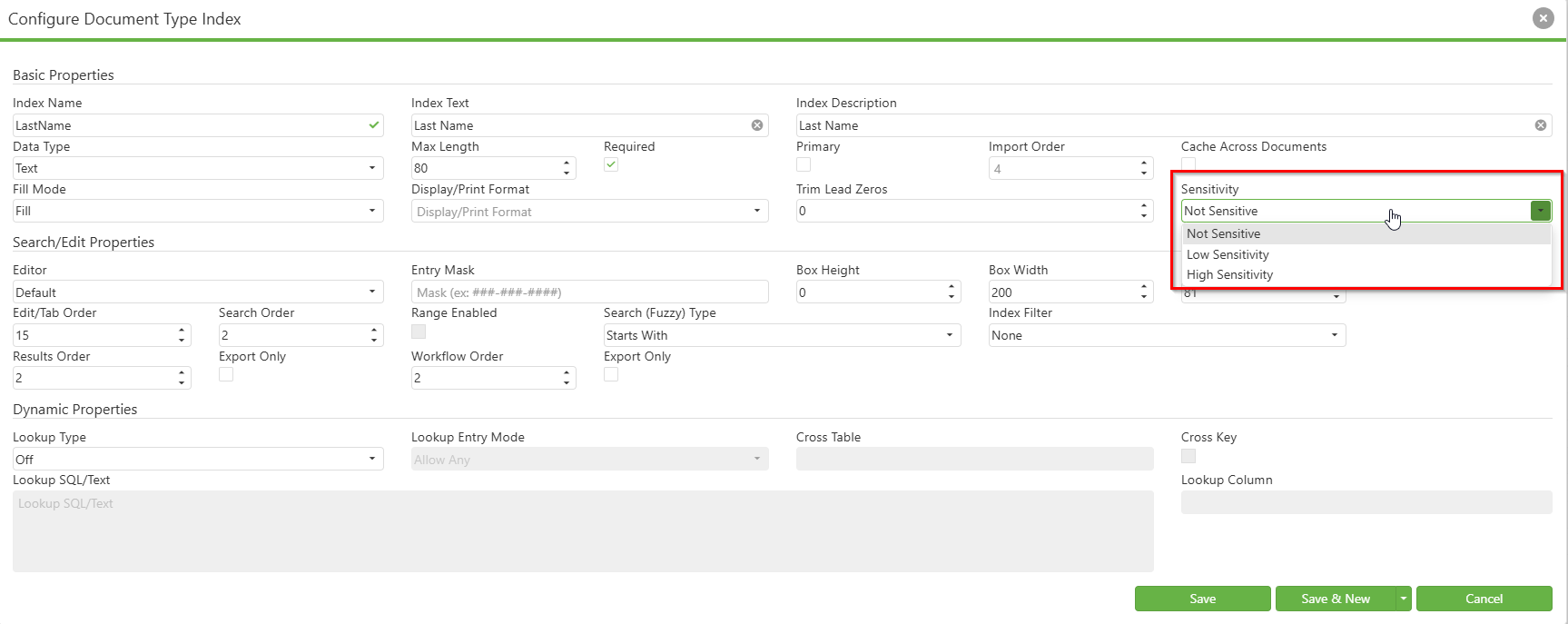 - Select "High Sensitivity" for fields that should be completely hidden from search results Click Save to apply the configuration