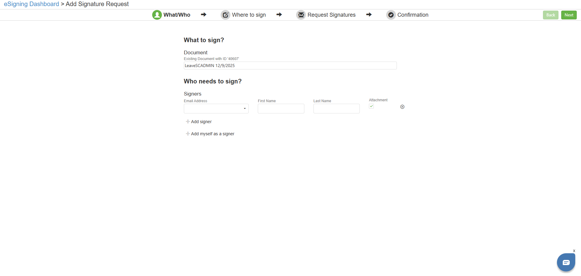 - Add Signature Request button not visible: Verify you have the appropriate permissions for eSigning. Contact your system administrator if the button remains unavailable.
