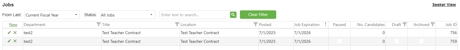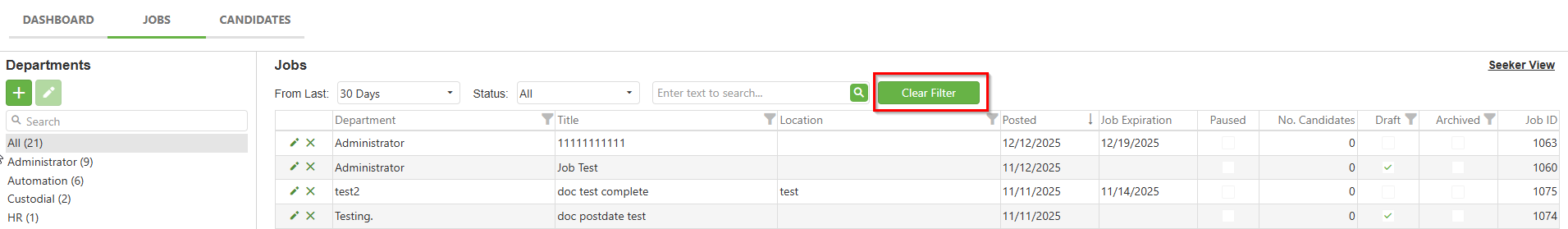 - Previously created jobs not visible: Check your filter settings and use the Clear Filter button to temporarily remove all filters, then verify you've selected the correct department