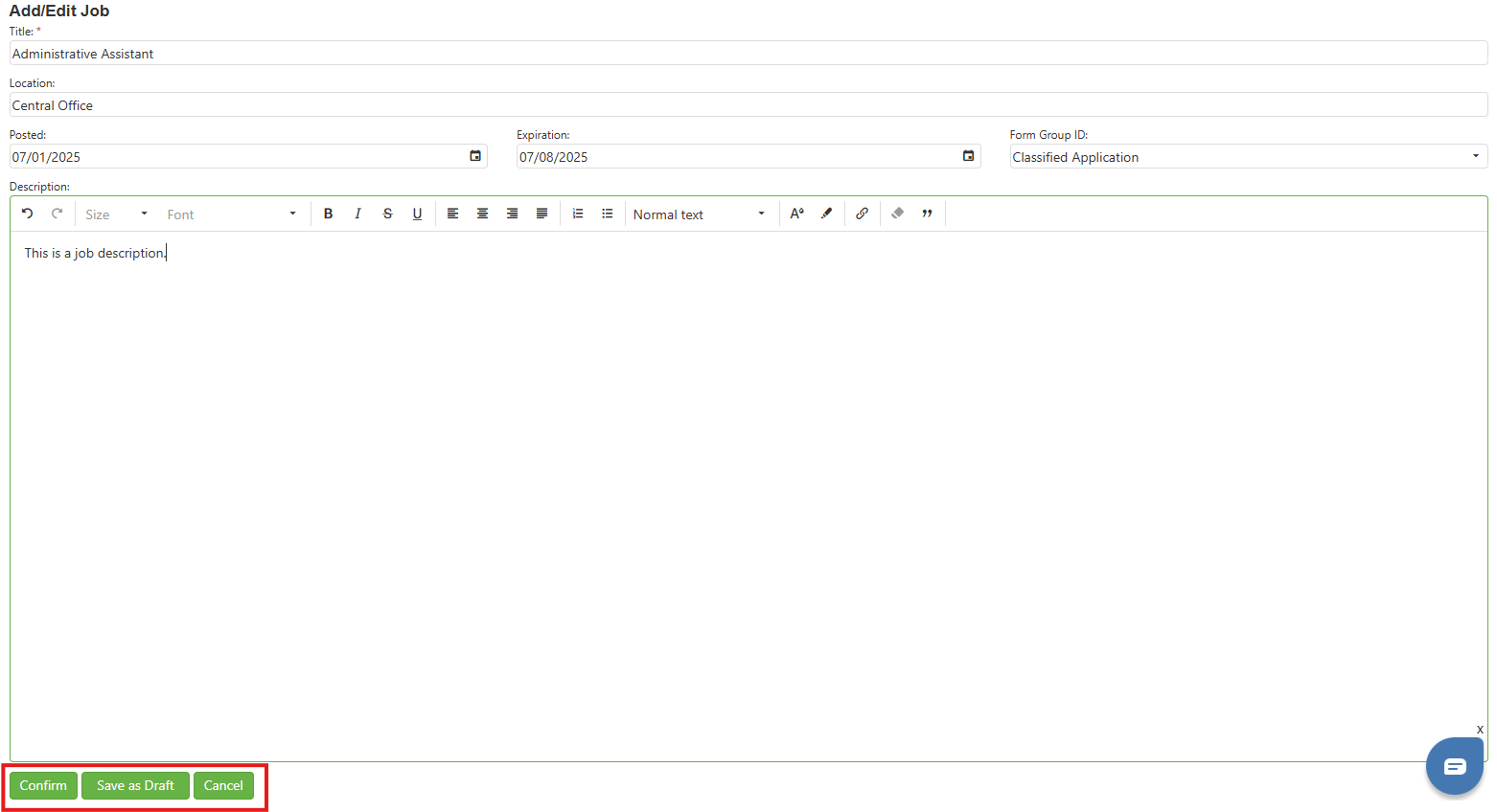 Step 4: Click on the Confirm button to add the job OR Click on the Cancel button if the user does not wish to add the job OR Save as Draft to finish later.